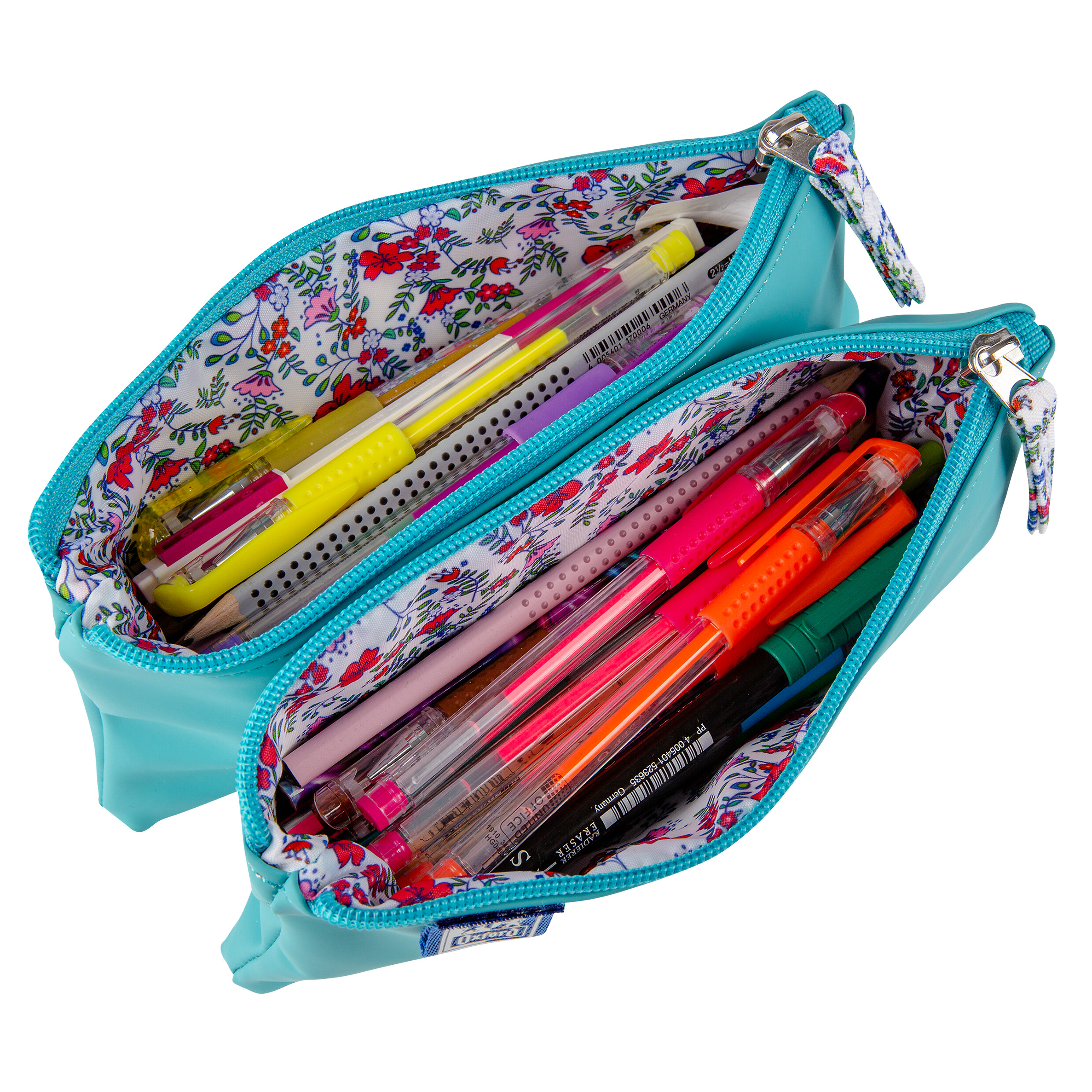 Podwójna saszetka z aksamitnego w dotyku materiału PU nawiązującego do kolekcji zeszytów Floral. Stanowi doskonały zestaw, za sprawą idealnie odwzorowanej kolorystyki, jak również satynowego wykończenia obu produktów. Materiał PU posiada wyjątkowe właściwości takie jak elastyczność, odporność na zniszczenia oraz łatwość czyszczenia. Pastelowa kolorystyka zachowuje elegancki styl a subtelny motyw kwiatowy zostaje przemycony w dodatkach. Niezwykle pojemne saszetki, zawierają 2 komory, oddzielnie zapinane na suwak, dzięki czemu możemy utrzymać maksymalny porządek w przyborach szkolnych i nie tylko. Sprawdzi się idealnie również jako kosmetyczka. Wewnątrz podszewka z grubego poliestru z ciekawym kwiatowym wzorem, jak również zawieszka suwaka która idealnie z nią koresponduje.