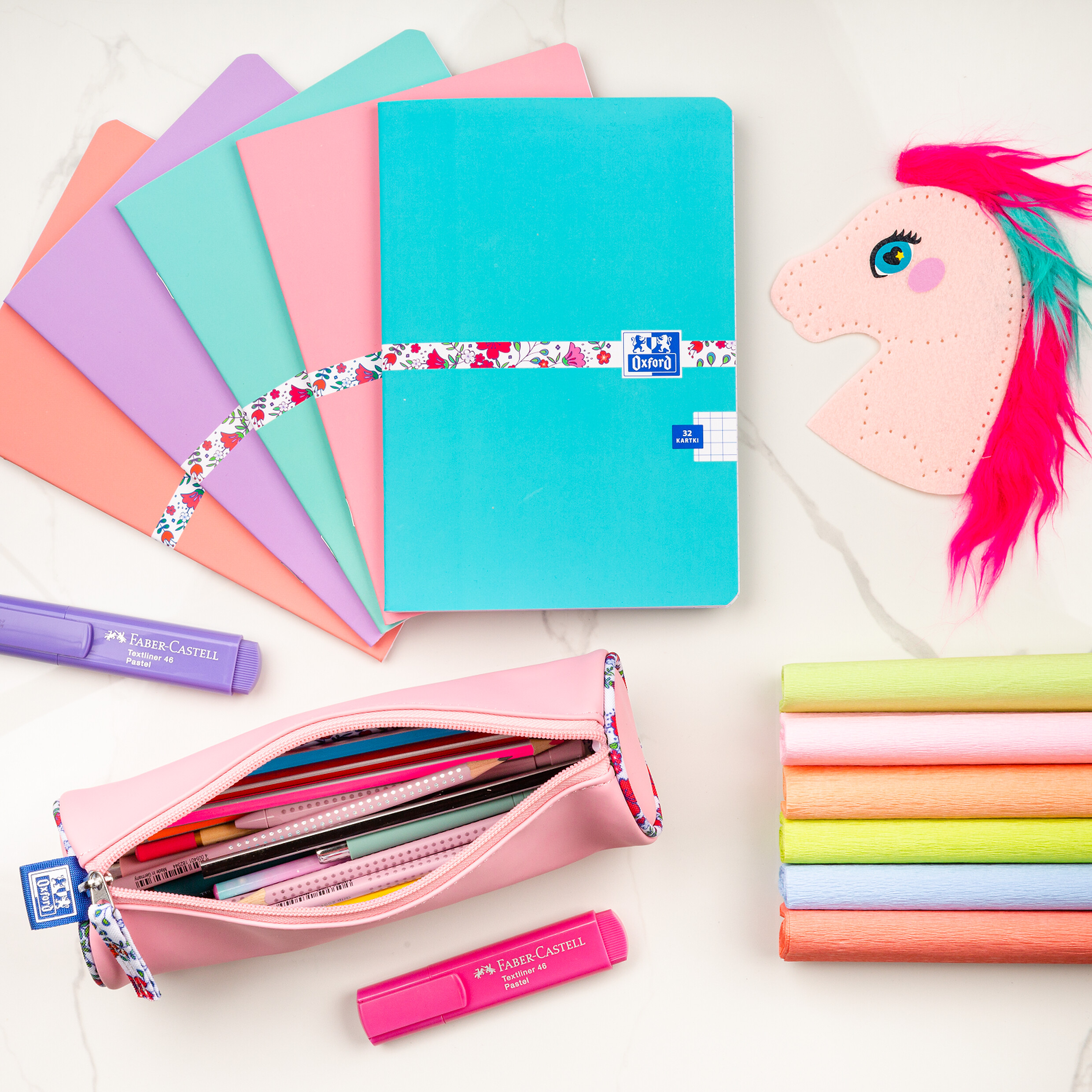 Piórnik z aksamitnego w dotyku materiału PU nawiązuje do kolekcji zeszytów Oxford Floral. Za sprawą idealnie odwzorowanej kolorystyki oraz satynowego wykończenia obu produktów stanowi doskonały zestaw. Materiał PU posiada wyjątkowe właściwości takie jak elastyczność, odporność na zniszczenia oraz łatwość czyszczenia. Pastelowa kolorystyka zachowuje elegancki styl. Wewnątrz podszewka z grubego poliestru z ciekawym kwiatowym wzorem oraz zawieszka suwaka korespondująca z wnętrzem piórników. Pojemne tuby o prostym kształcie i subtelnym motywem kwiatowym przemyconym w dodatkach stanowią idealne uzupełnienie wyposażenia każdego ucznia.