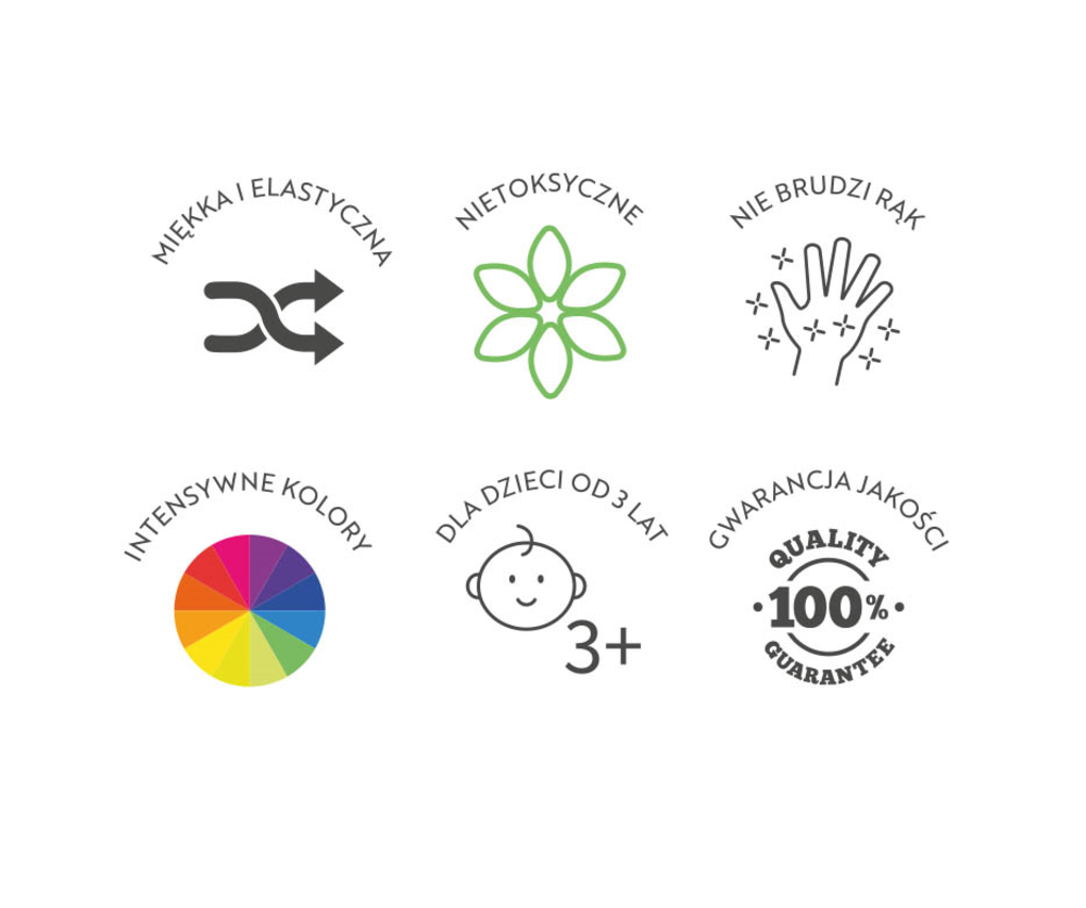 - Produkt wielofunkcyjny - doskonale nadaje się do budowania figurek, wycinania kształtów foremkami oraz wyklejania mozajek na papierze