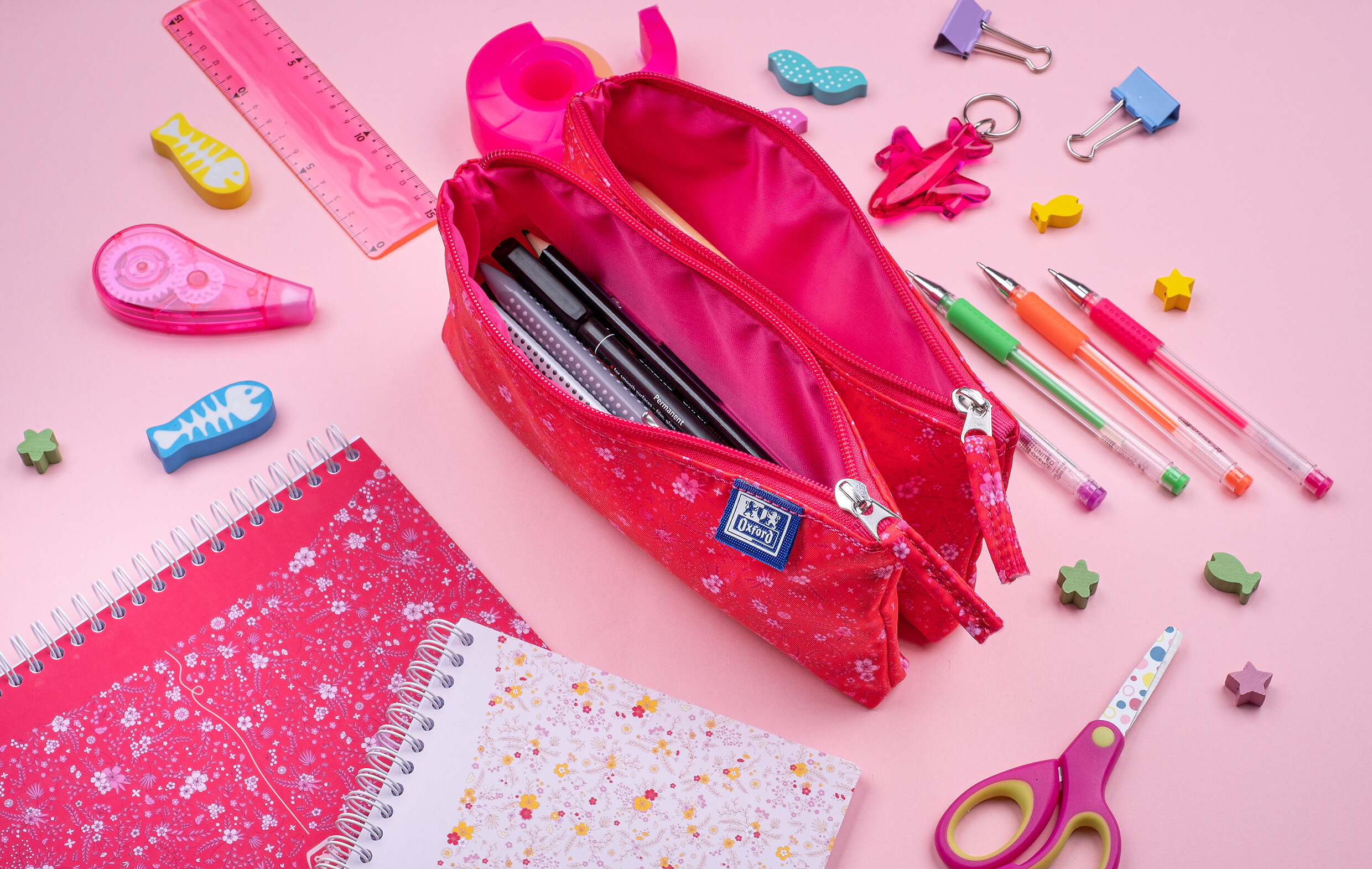 Piórnik z tkaniny poliestrowej z satynowym wykończeniem, która nadaje lekkiego błysku, odporności na zabrudzenia, a jednocześnie podkreśla mocne kolory nawiązujące do kolekcji zeszytów Oxford Floral. Stanowi doskonały zestaw za sprawą idealnie odwzorowanej kolorystyki oraz satynowego wykończenia obu produktów. Materiał jest pokryty kwiatowym nadrukiem. Pojemne tuby o klasycznym kształcie. Wewnątrz podszewka wykonana z tkaniny poliestrowej w jednolitym kolorze jak również zawieszka suwaka nawiązujący do kolorystyki piórnika.